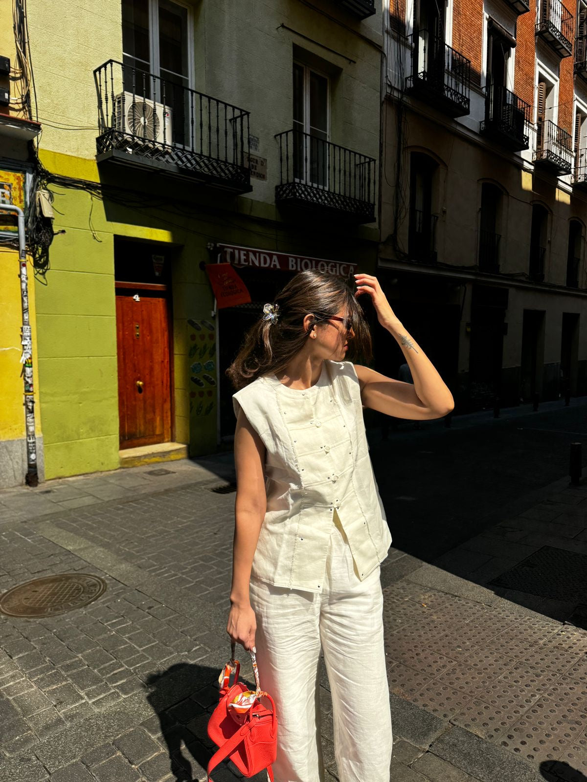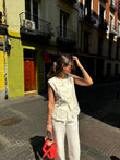 This two-piece co-ord set features a sleeveless top with hand-detailed pearl buttons and gold dot accents that lend a touch of quiet luxury. The structured pleat front adds dimension, while side pockets offer functional charm.