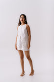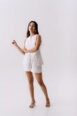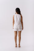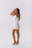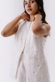 This crisp white co-ord set radiates fresh, modern elegance with its sleeveless longline top and matching tailored shorts. Crafted from breathable fabric and detailed with subtle bead embellishments, it offers a refined yet relaxed vibe. The clean lines and functional pockets make it perfect for summer brunches, resort getaways, or effortlessly chic daytime wear.