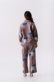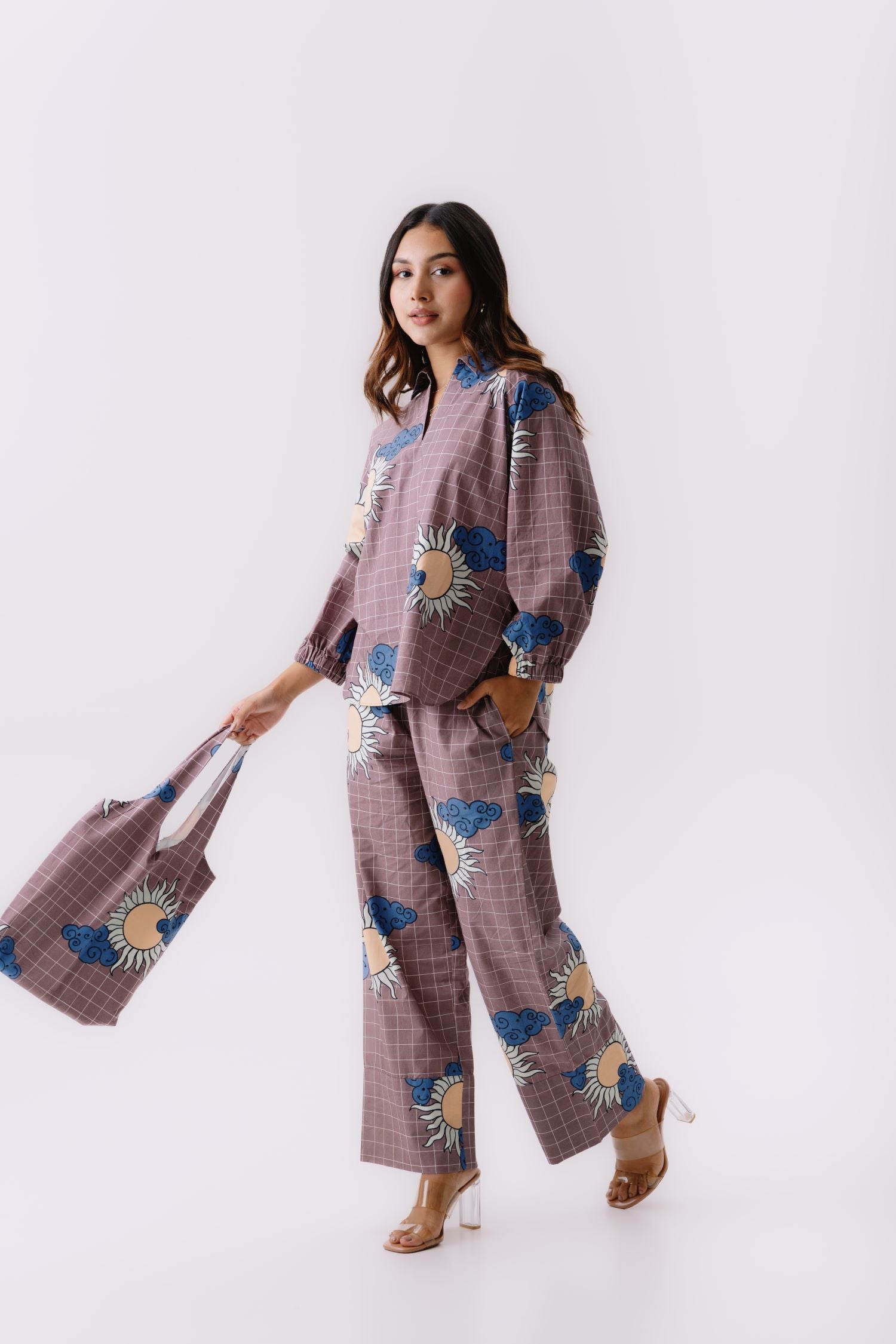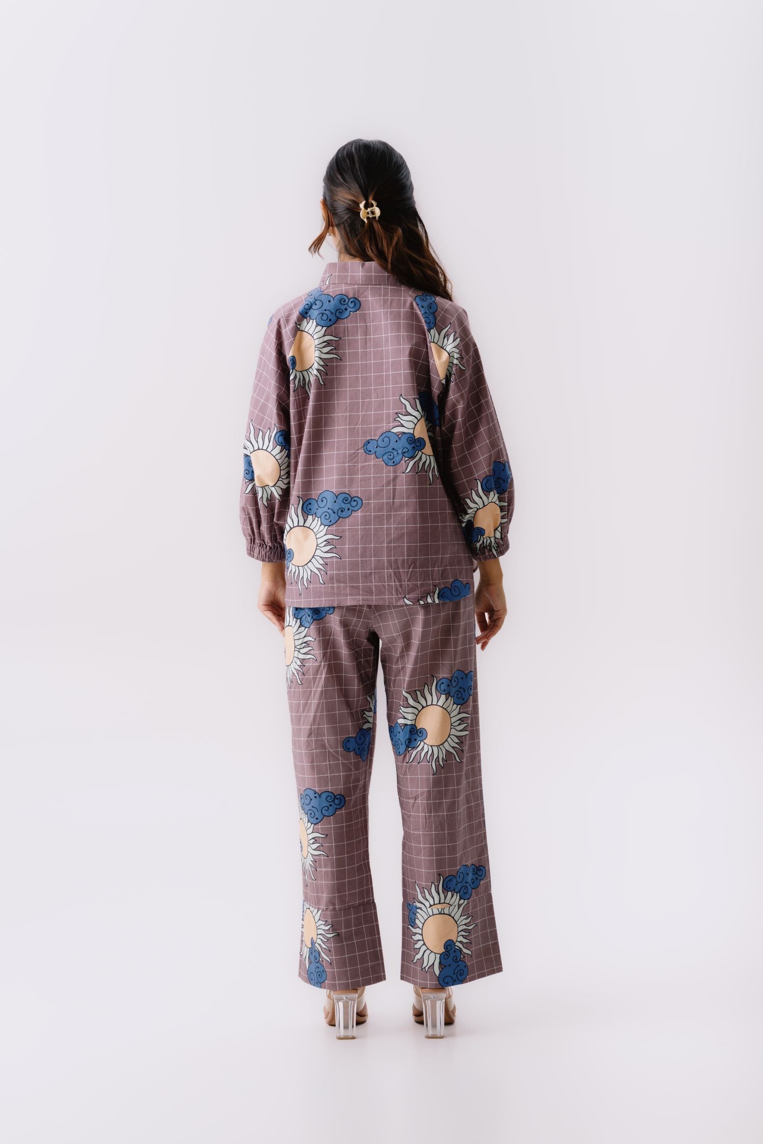 Step into bold style with this mauve co-ord set featuring a relaxed, long-sleeve top and wide-leg trousers. Designed with a grid check pattern as the base, the set is brought to life with eye-catching sun and cloud motifs in vibrant blue, white, and gold tones. Made from lightweight, breathable fabric, this set combines comfort with artistic flair — perfect for casual outings or lounging in elevated style.