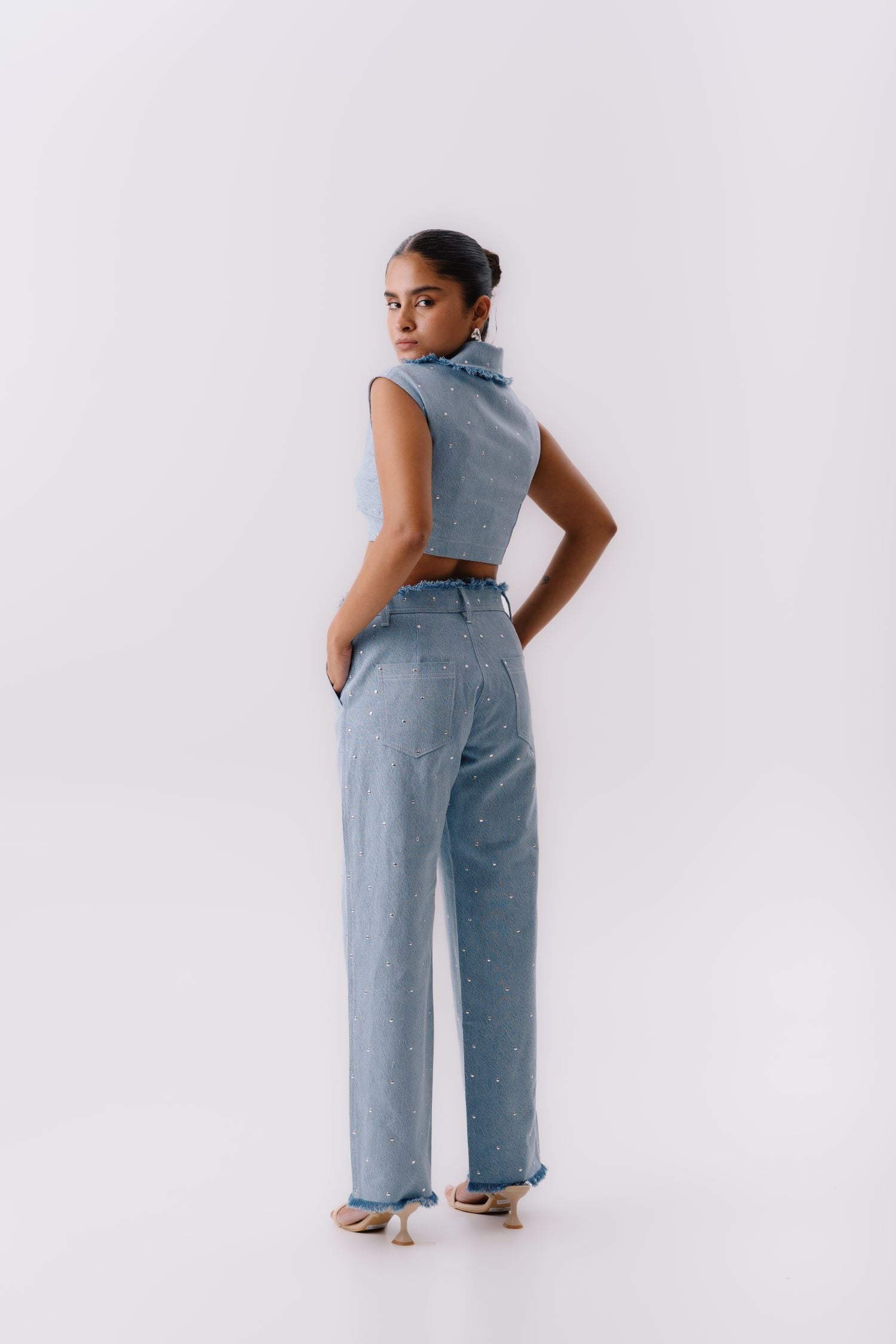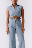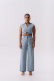Light blue denim co-ord featuring a sleeveless collared crop top with ruched detailing and high-waisted straight-leg trousers. Embellished with delicate silver studs and frayed hems for a modern, chic edge.”