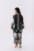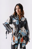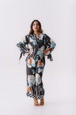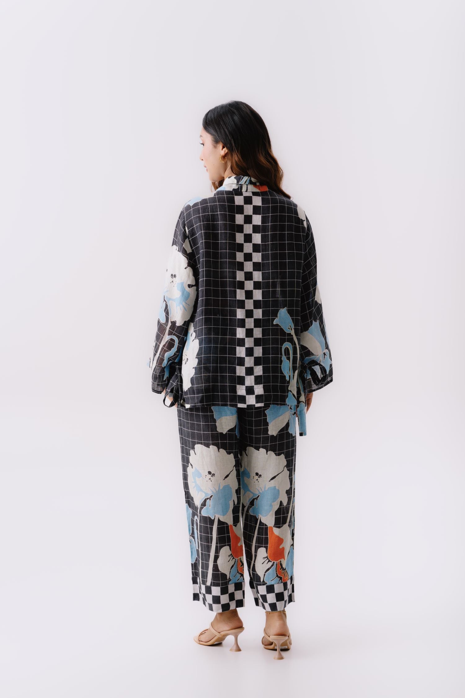 A bold, statement co-ord featuring oversized floral prints in vibrant hues against a graphic grid base. The relaxed-fit shirt with tie-up sleeves pairs effortlessly with wide-leg pants for a look that’s equal parts comfort and style.